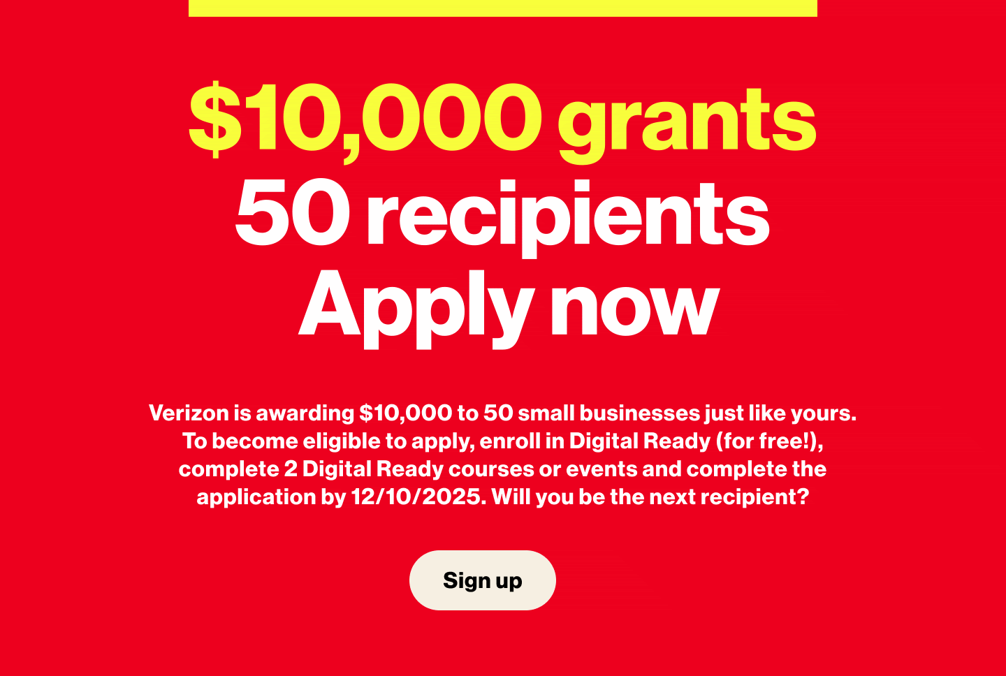 As part of this initiative, Verizon is awarding $10,000 grants to 50 small businesses. To qualify, enroll in Digital Ready for free, complete two courses or events, and submit your application by December 10, 2025. Will your business be one of the next winners?